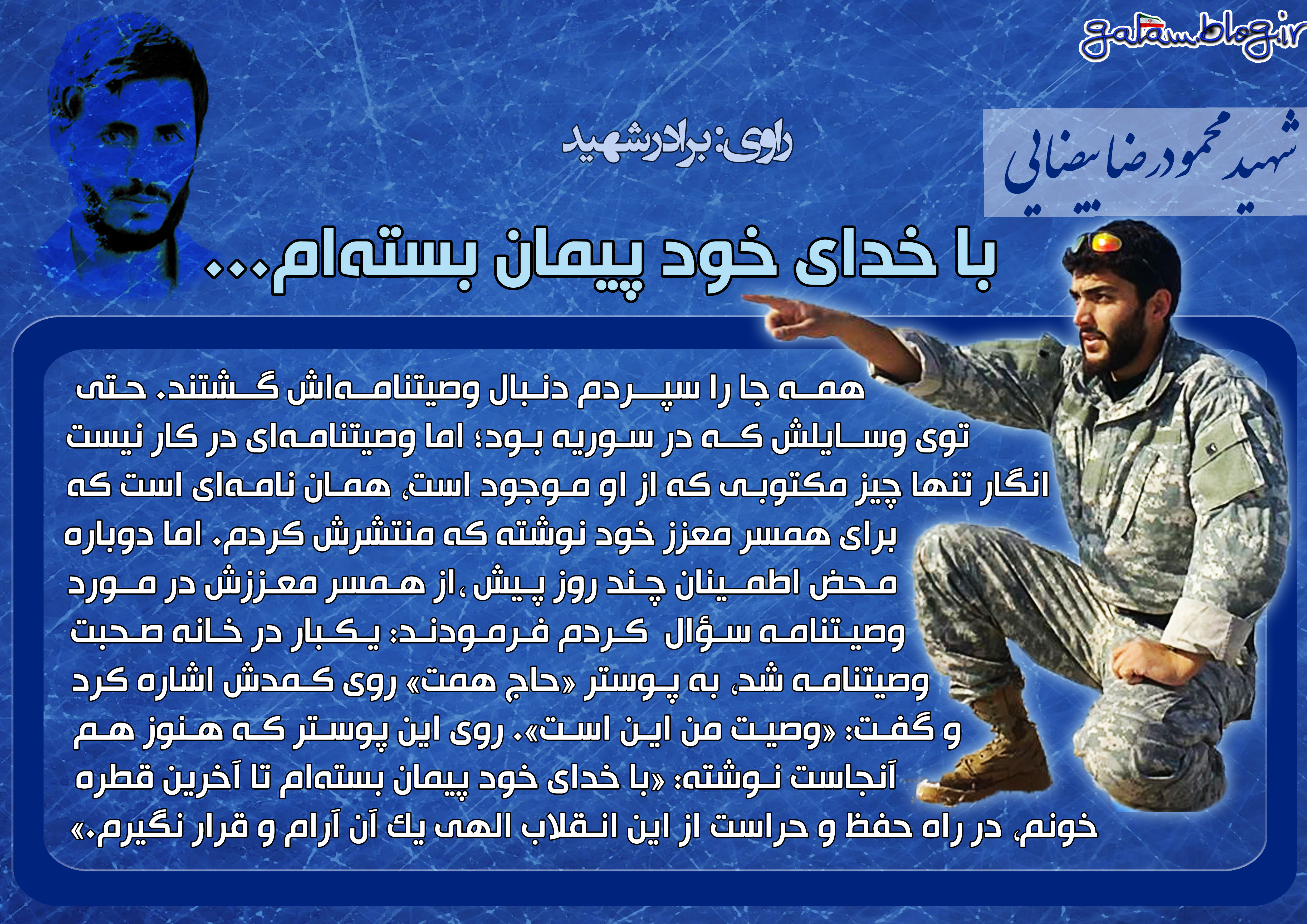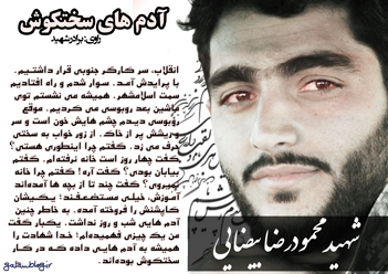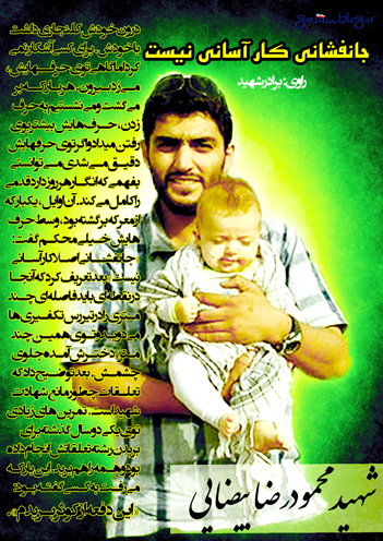 همه چیز در خانه عادی است. پذیرایی همسرش، بازی دختر دو سالهاش، بساط چایی، شام روی گاز، تلویزیون روشن، پتوهای سادهای که کنار دیوار پهن هستند و خود محمودرضا، چهره همیشه آرامش، همه چیز مثل همیشه توی این خانه معمولی، معمولی و عادی است و سر جای خودش. هیچ علامتی از خبر خاصی به چشم نمیخورد. مینشینیم. منتظر میمانم تا سر صحبت را باز کند ولی حرفی نمیزند. دو سه ساعت تمام منتظر میمانم اما حرفهایمان کاملا عادی پیش میروند. سعی میکنم صبور باشم تا سر صحبت را باز کند ولی او حاضر نیست چیزی به زبان بیاورد. بالاخره صبرم تمام میشود و میگویم بگو! میگوید من شهید شدم بنظر تو محل دفنم تبریز باشد یا تهران؟! میگویم این حرفها را بگذار کنار و مثل همیشه بلند شو برو مأموریتت را انجام بده، شهید شدی، من یک فکری برایت میکنم! بدون اینکه تغییری در چهرهاش ایجاد بشود با آرامش شروع میکند به توضیح دادن در مورد اینکه اگر تبریز دفن بشود چطور میشود و اگر تهران دفن بشود چطور؟ عین کلوخ مقابلش پخش میشوم وقتی دارد اینطور عادی درباره دفن شدنش حرف میزند. جدی نمیگیرم. هر چند همیشه در مأموریتهایش احتمال شهادت روی شاخش است. تلاشش برای جواب گرفتن از من درباره انتخاب محل دفنش و فهماندن قضیه به من که شهادتش در این سفر قطعی است نتیجه نمیدهد.